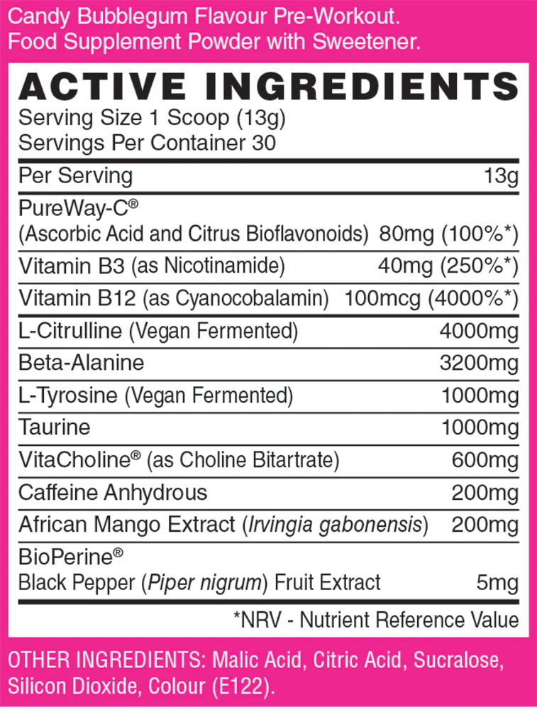 Ingrédients Candy Bubblegum : L-citrulline, bêta-alanine, taurine, l-tyrosine, acidifiants (acide malique, acide citrique), arôme, bitartrate de choline, antiagglomérant (dioxyde de silicium [nano]), caféine anhydre, extrait de graine de manguier sauvage (Irvingia gabonensis (Aubry-Lecomte ex O'Rorke) Baill.), edulcorant (sucralose), vitamine C PureWay-C® (acide L-ascorbique, citroflavonoïdes), niacine (nicotinamide), colorant (carmoisine)(La carmoisine peut avoir des effets indésirables sur l'activité et l'attention chez les enfants), pipérine de poivrier noir (Piper nigrum L., fruit), cyanocobalamine (vitamine B12).